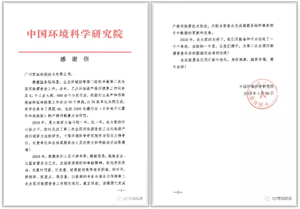 中國(guó)環(huán)境科學(xué)研究院致信京誠(chéng)檢測(cè)集團(tuán),對(duì)我集團(tuán)2018年度在全國(guó)第二次污染源普查項(xiàng)目工業(yè)污染源產(chǎn)排污核算工作中全體參與人員的努力和奉獻(xiàn)表示由衷感謝。