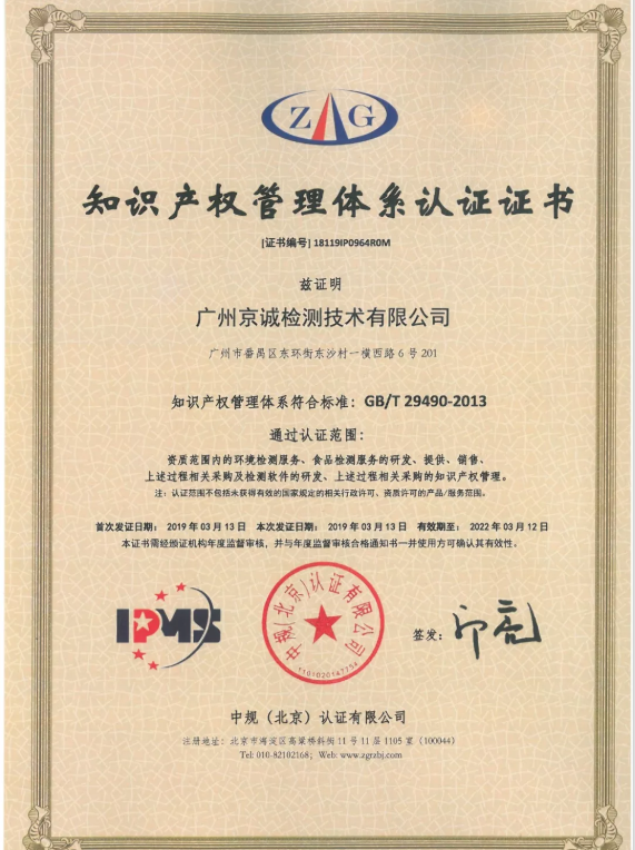 廣州京誠檢測技術(shù)有限公司知識產(chǎn)權(quán)體系符合標(biāo)準(zhǔn)GB/T 29490-2013,通過認(rèn)證范圍為:資質(zhì)范圍內(nèi)環(huán)境檢測服務(wù)、食品檢測服務(wù)的研發(fā)、提供、銷售、上述過程相關(guān)采購及檢測軟件的研發(fā)、上述過程相關(guān)采購的知識產(chǎn)權(quán)管理。