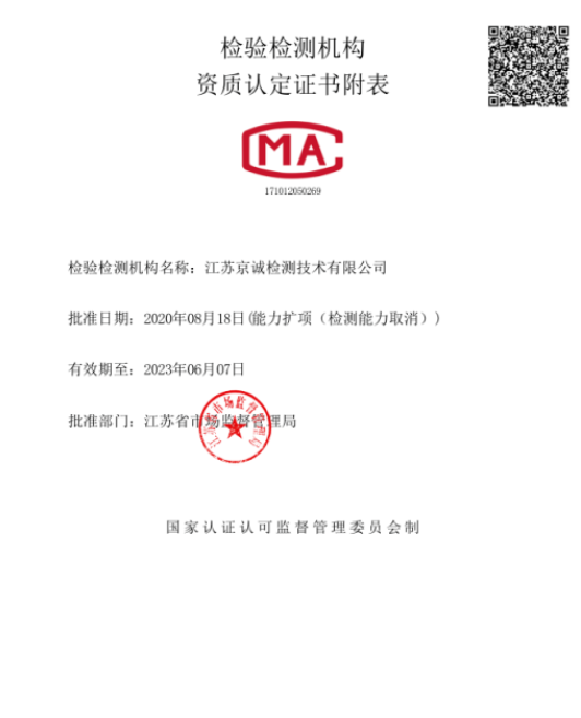 江蘇京誠(chéng)檢測(cè)技術(shù)有限公司于2020年5月21日提交了CMA資質(zhì)評(píng)審擴(kuò)項(xiàng)材料,7月18~19日進(jìn)行現(xiàn)場(chǎng)評(píng)審,最終于2020年8月18日獲得CMA擴(kuò)項(xiàng)資質(zhì)附表。本次擴(kuò)項(xiàng)獲得資質(zhì)參數(shù)共計(jì)151項(xiàng)。截止目前,CMA資質(zhì)參數(shù)共計(jì)866項(xiàng)。