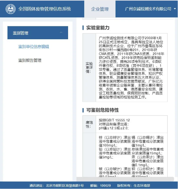 日前,國(guó)檢京誠(chéng)集團(tuán)廣州、安徽、云南、內(nèi)蒙、江蘇、北京、青島、新疆等公司順利通過全國(guó)危險(xiǎn)廢物鑒別信息公開服務(wù)平臺(tái)(以下簡(jiǎn)稱信息平臺(tái),https://gfmh.meescc.cn)注冊(cè)審批,可開展危廢鑒別相關(guān)服務(wù)。