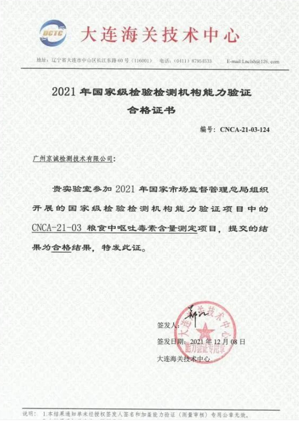 國(guó)檢京誠(chéng)集團(tuán)廣州、青島、湖南、西安等多家實(shí)驗(yàn)室參加本次國(guó)家級(jí)能力驗(yàn)證,參數(shù)包括CNCA—21—03糧食中嘔吐毒素含量檢測(cè)、CNCA—21—04蜂蜜中氯霉素和硝基咪唑類檢測(cè)、CNCA—21—05果蔬中農(nóng)殘的測(cè)定、CNCA—21—09復(fù)合肥料主成分含量檢測(cè)、水中揮發(fā)性有機(jī)物檢測(cè)(三氯甲烷、四氯化碳)檢測(cè)等。各實(shí)驗(yàn)室在每個(gè)檢測(cè)環(huán)節(jié)都嚴(yán)格按照相關(guān)標(biāo)準(zhǔn)執(zhí)行,經(jīng)過(guò)組織單位和技術(shù)專家對(duì)能力驗(yàn)證結(jié)果的技術(shù)審查、統(tǒng)計(jì)分析和綜合評(píng)價(jià),最終以優(yōu)良的成績(jī)通過(guò)考核!