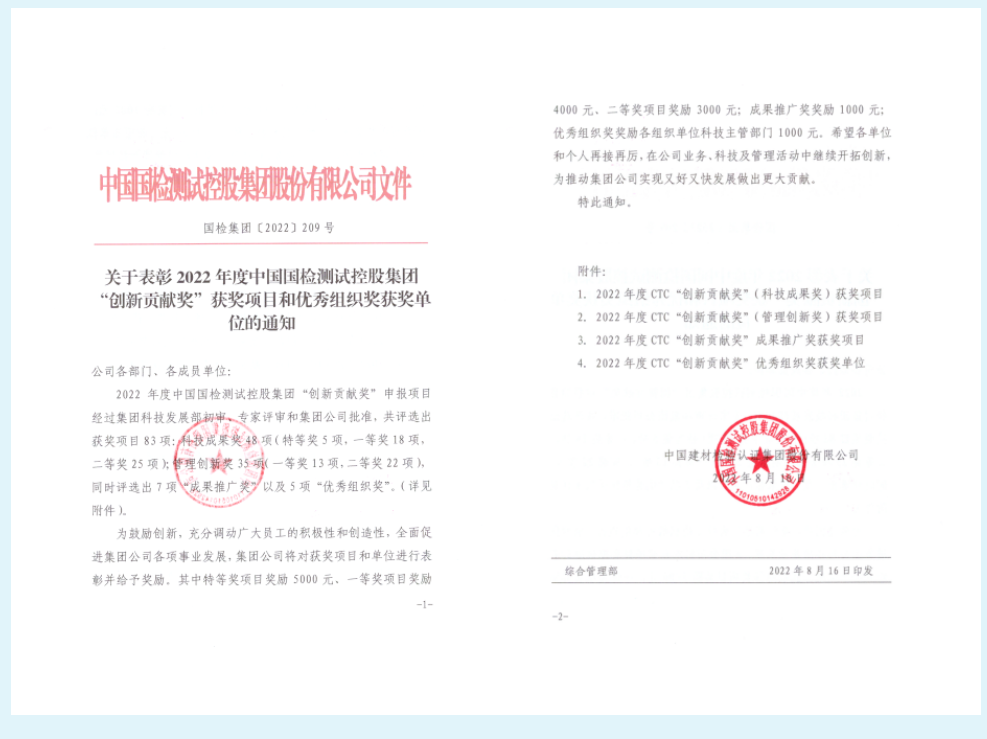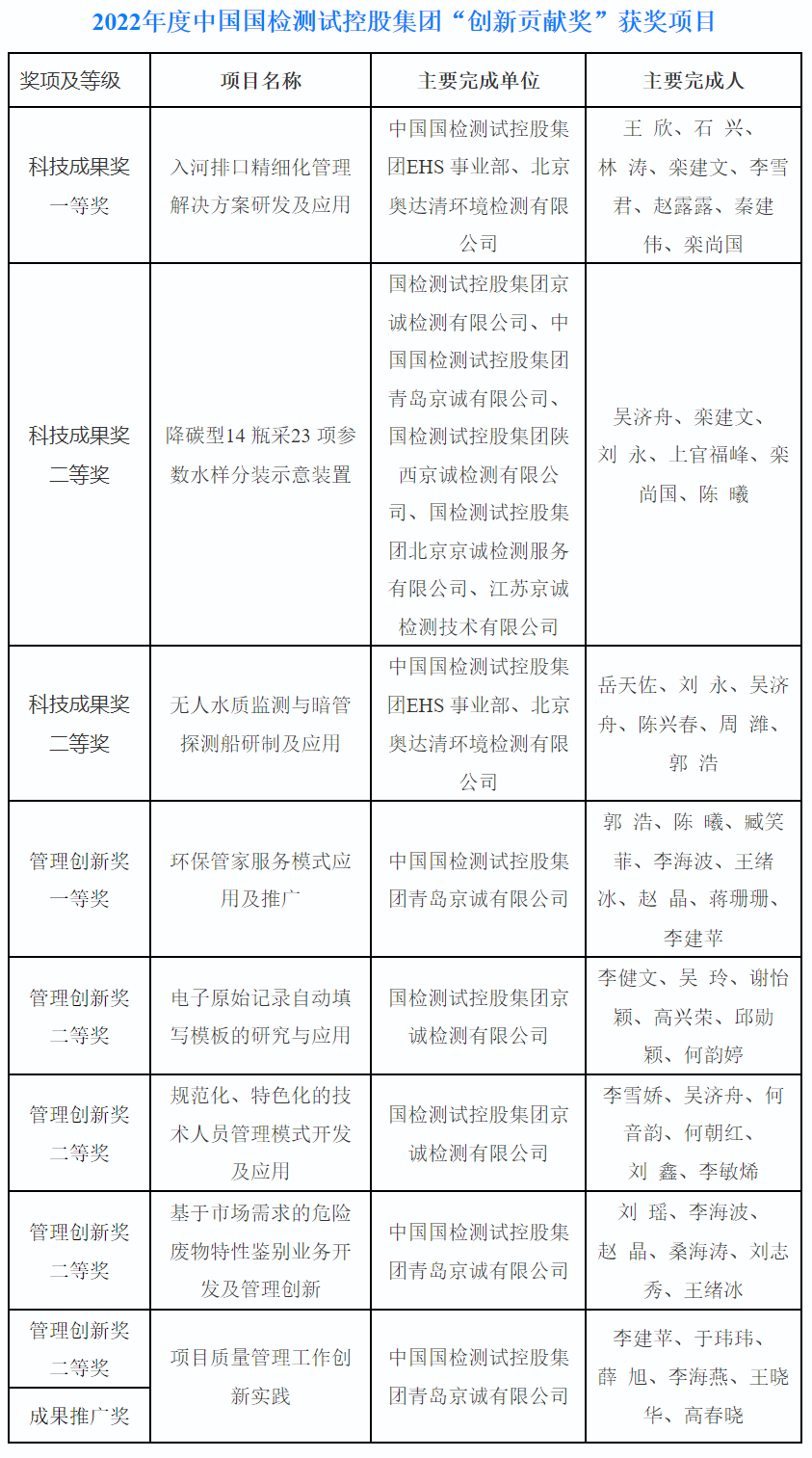 近日,中國國檢測試控股集團公布了2022年度“創(chuàng)新貢獻獎”獲獎項目,國檢京誠集團表現(xiàn)突出,共獲科技成果獎1項、管理創(chuàng)新獎5項(其中一等獎1項)以及成果推廣獎1項。此外,參與中國國檢測試控股集團EHS事業(yè)部兩項項目,分別獲得科技成果一等獎和二等獎。