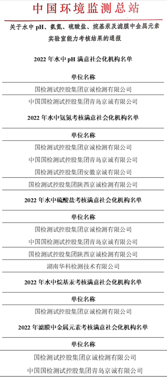 近日,中國環(huán)境監(jiān)測總站發(fā)布了“關(guān)于水中pH、氨氮、硫酸鹽、烷基汞及濾膜中金屬元素實(shí)驗(yàn)室能力考核結(jié)果的通報(bào)”,國檢京誠集團(tuán)廣州、青島、安徽、陜西、湖南實(shí)驗(yàn)室通過相應(yīng)的考核并取得“滿意”結(jié)果。