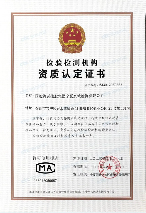 4月27日,國檢京誠集團寧夏公司首次獲得檢驗檢測機構(gòu)資質(zhì)認(rèn)定證書(CMA),標(biāo)志著該司可向社會提供公正權(quán)威的檢測報告。