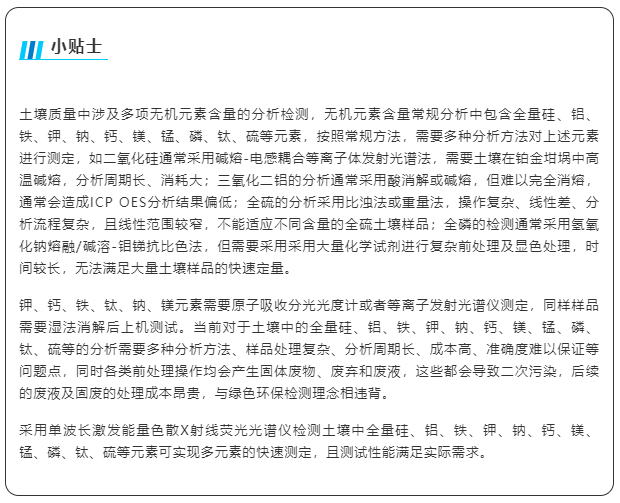 目前,尚無一項標準方法能夠同步精確檢測土壤中全量硅、鋁、鐵、鉀、鈉、鈣、鎂、錳、磷、鈦、硫等無機元素含量,本分析方法標準的制定擬解決土壤中全量硅、鋁、鐵、鉀、鈉、鈣、鎂、錳、磷、鈦、硫等無機元素含量的測定,方法適應(yīng)各類土壤類型,同時具備檢測速度快、分析成本低、準確度高等特點。解放勞動力,減少投資成本,提高樣品分析通量,同時制樣簡單、無復(fù)雜前處理,樣品無損,不產(chǎn)生二次污染,對人體和環(huán)境健康友好。
