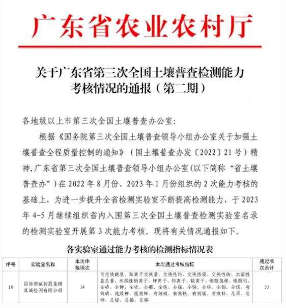 近日,廣東省第三次全國土壤普查領導小組辦公室對省內(nèi)入圍土壤三普實驗室進行了第三次能力考核,國檢京誠集團申報的34項指標全部合格!