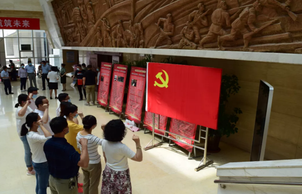 參觀學(xué)習(xí)前,全體黨員面向黨旗,緊握右拳、高舉手臂,莊嚴(yán)重溫入黨誓詞。